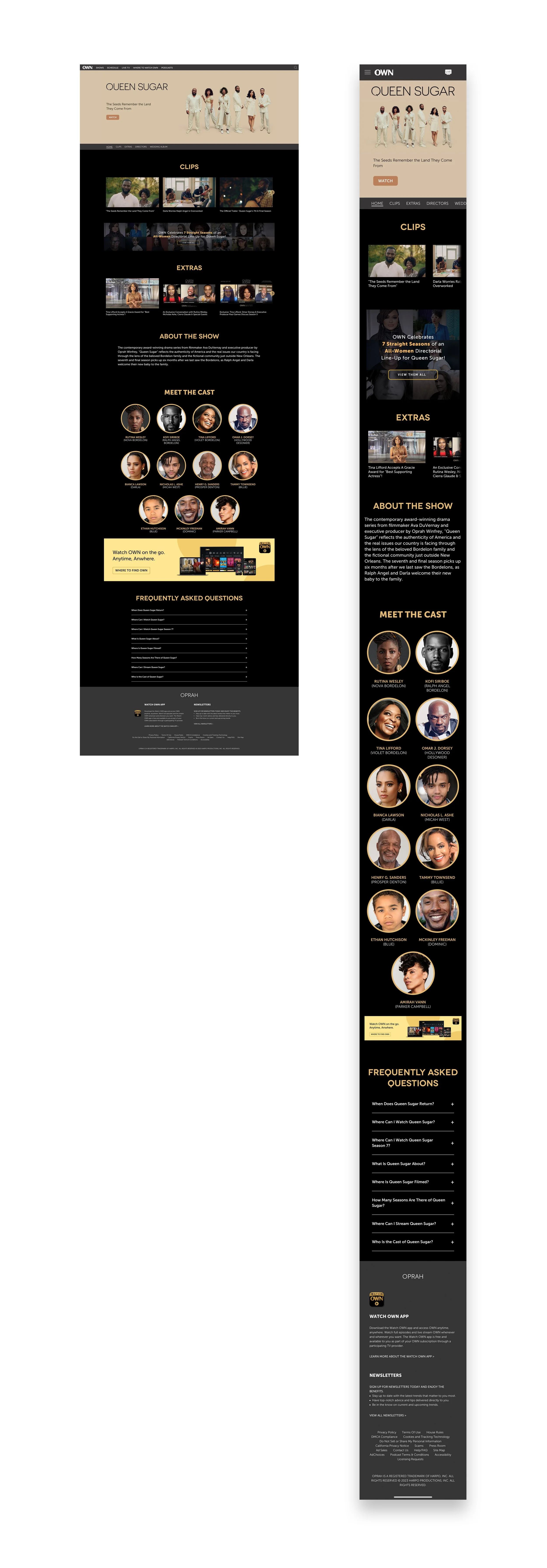 Queen Sugar remains OWN's most popular and highly-acclaimed scripted series to date. This show page, which we redesigned ahead of the seventh and final season premiere, serves as a detailed source that answers where to view Queen Sugar and related queries. The page is responsive for users across all devices.